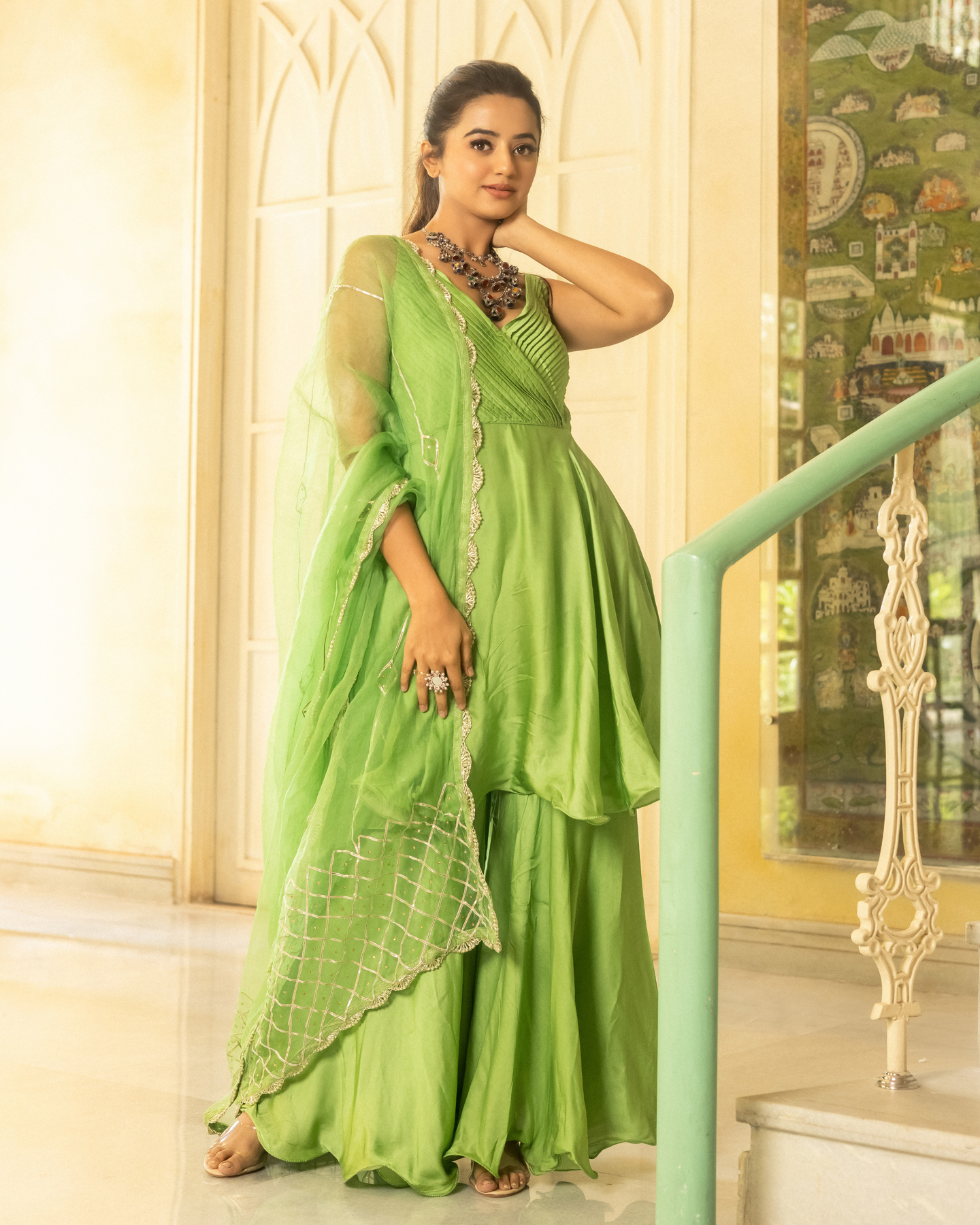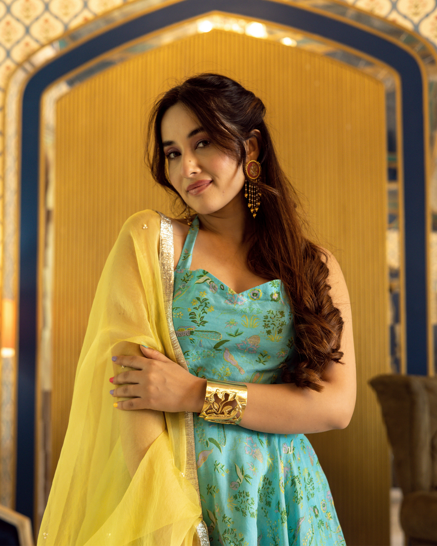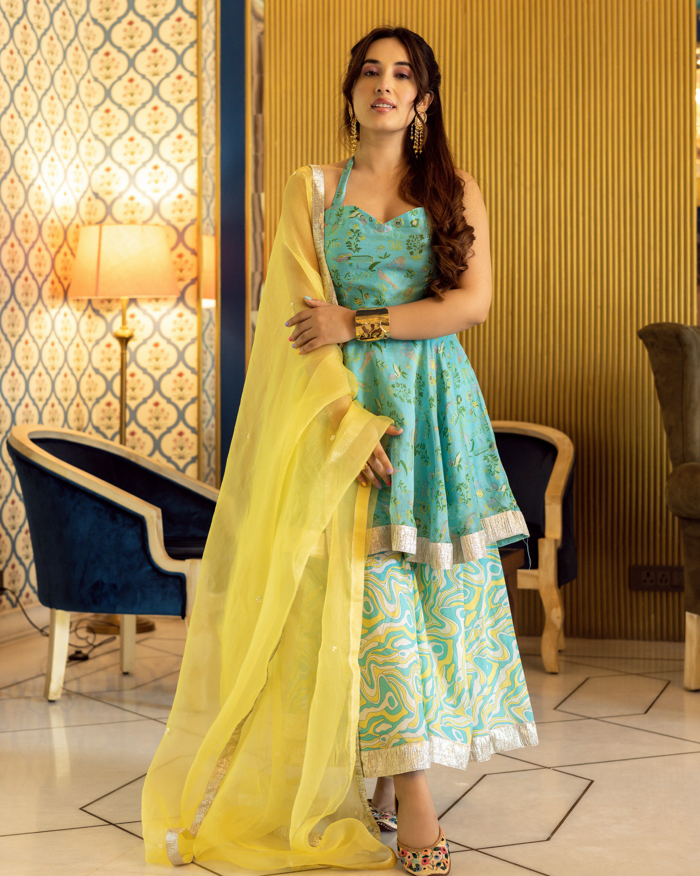 Light, bright, and full of life, this suit set will make a delightful addition to your wardrobe. Tailored with flowy silhouettes with classic golden prints, it is spruced up with a trendy fit.