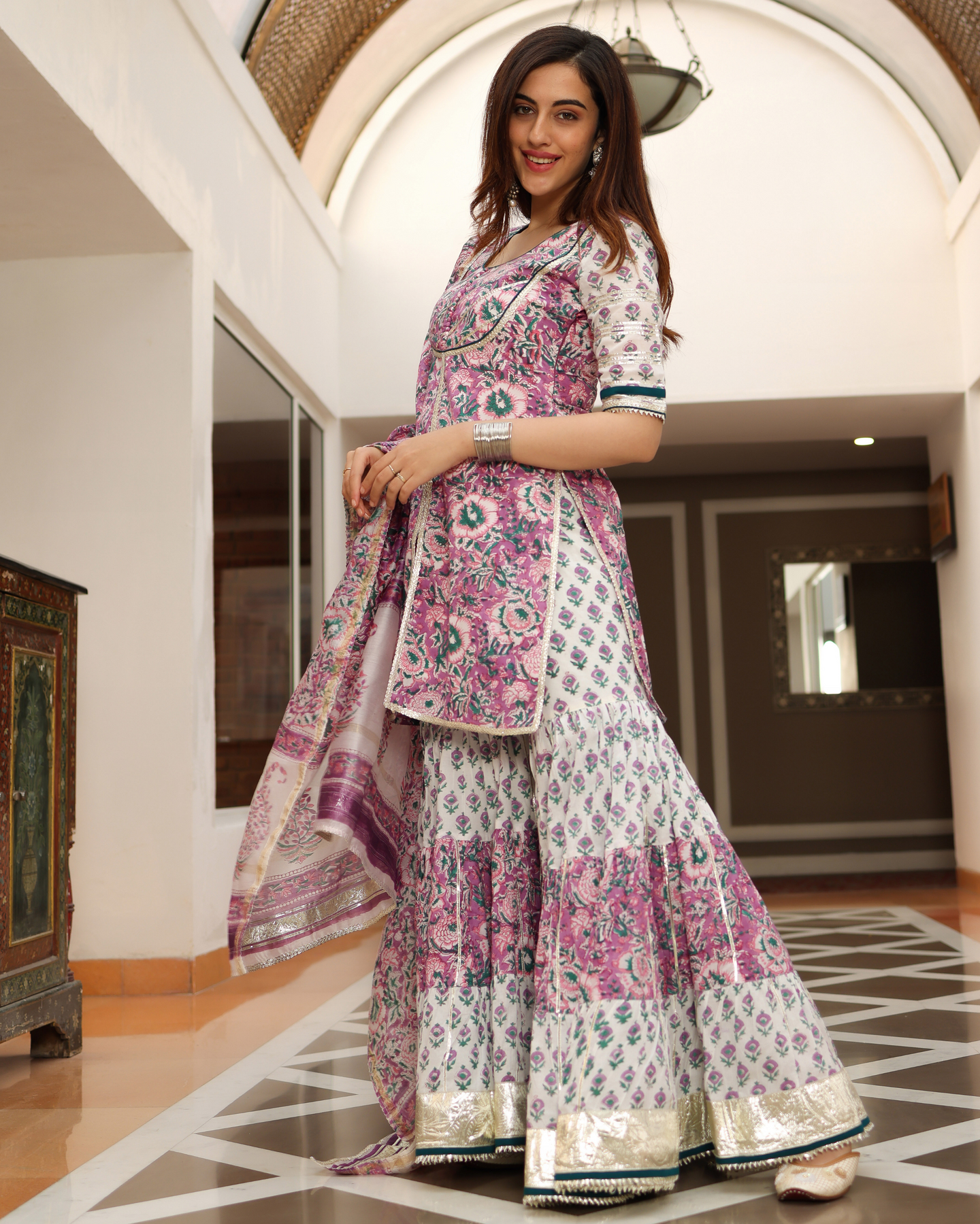 Light, bright, and full of life, this suit set will make a delightful addition to your wardrobe. Tailored with flowy silhouettes with classic golden prints, it is spruced up with a trendy fit.