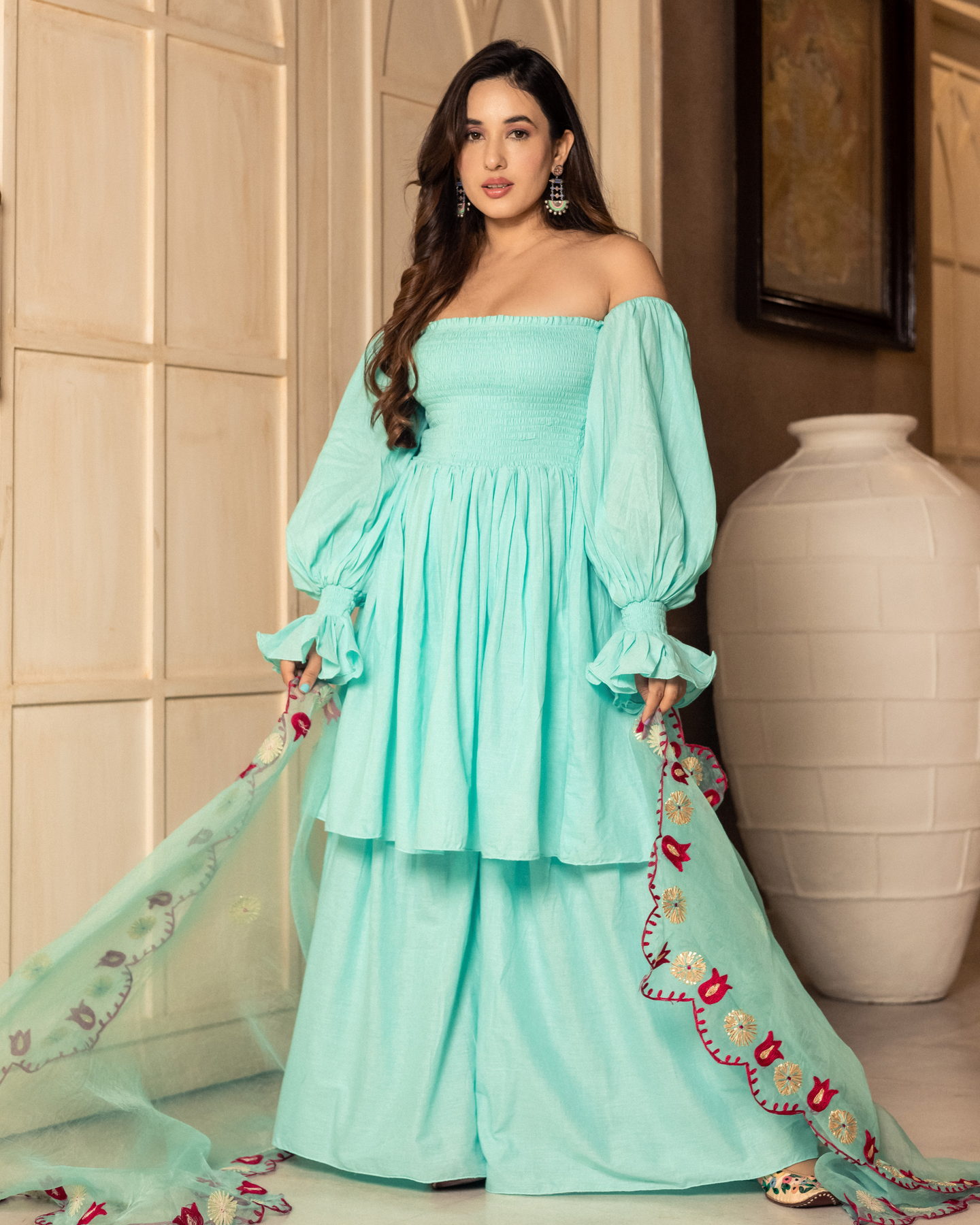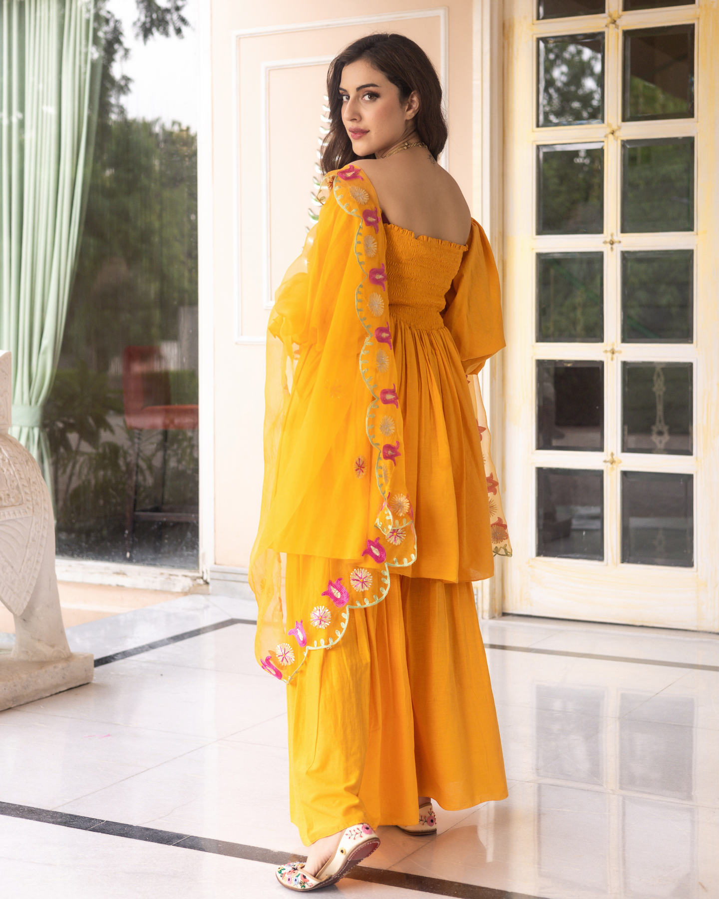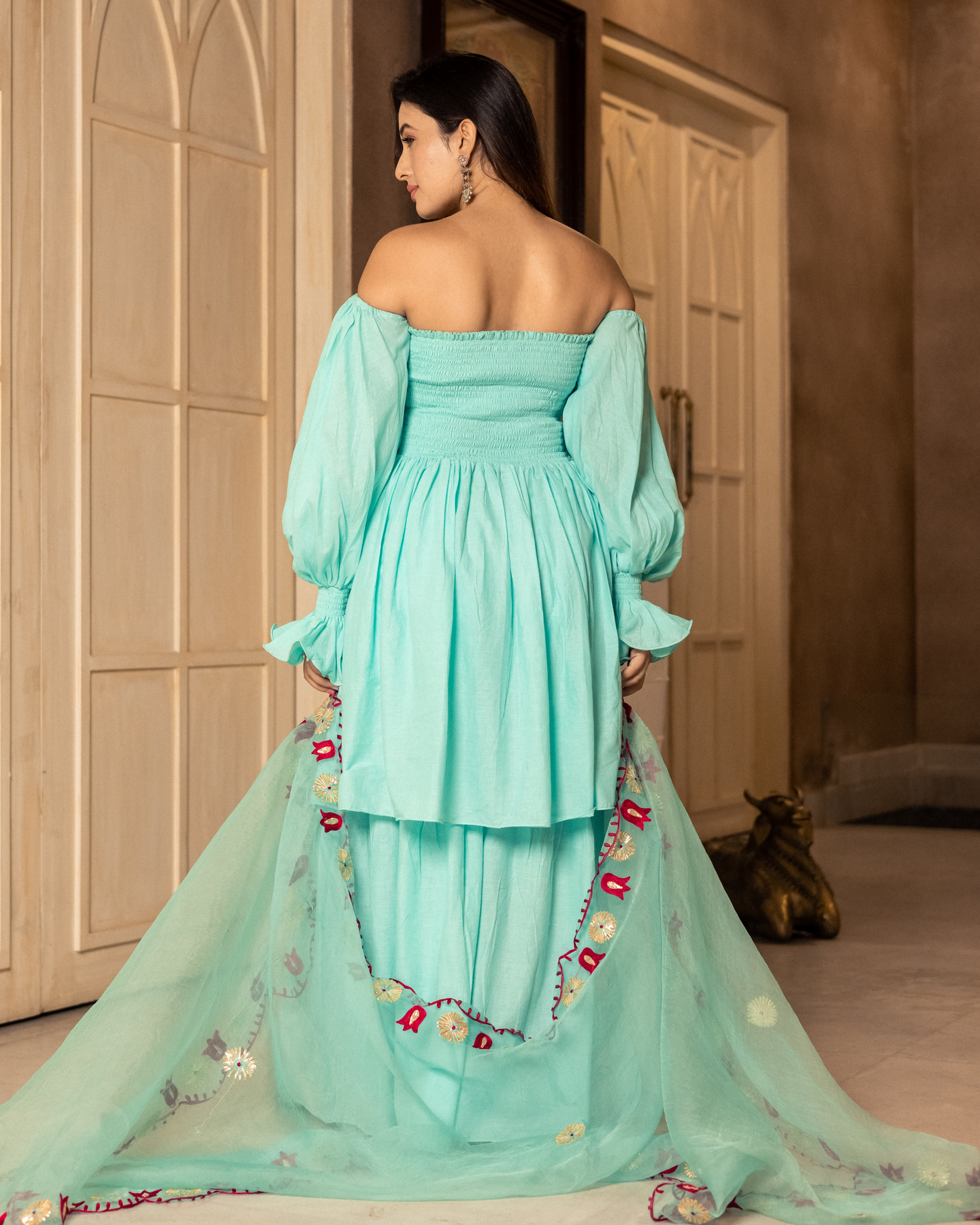 Natural-dyed colors might bleed during the first few washes or rub against the skin & other light-colored garments. In the artful process of hand block-printing, embroidery work and stitching, variations are likely to come into existence. These irregularities are the hallmark of all handmade products and give each style a unique identity.
