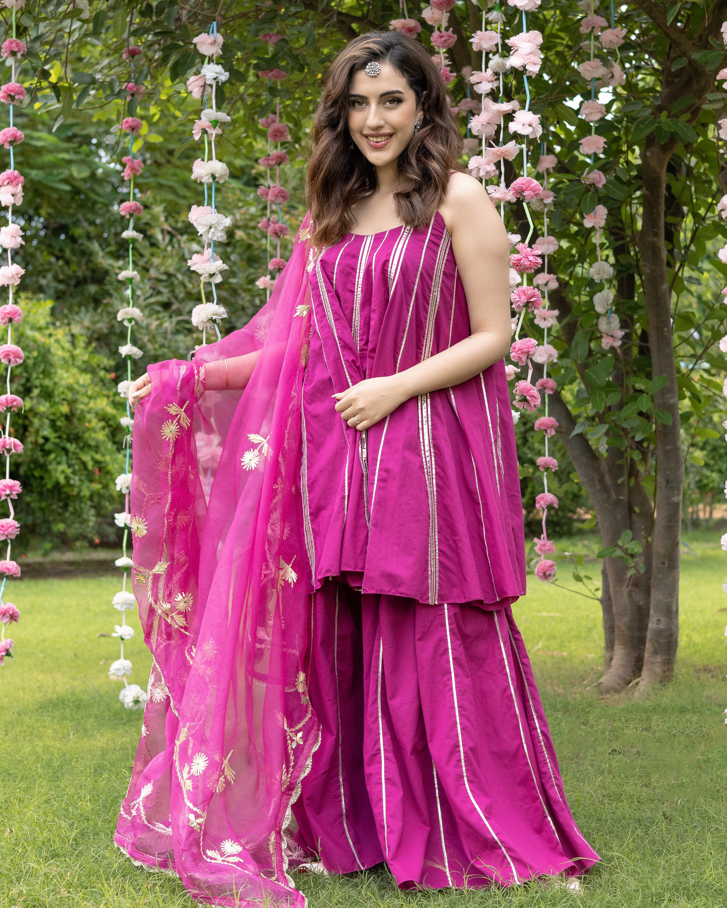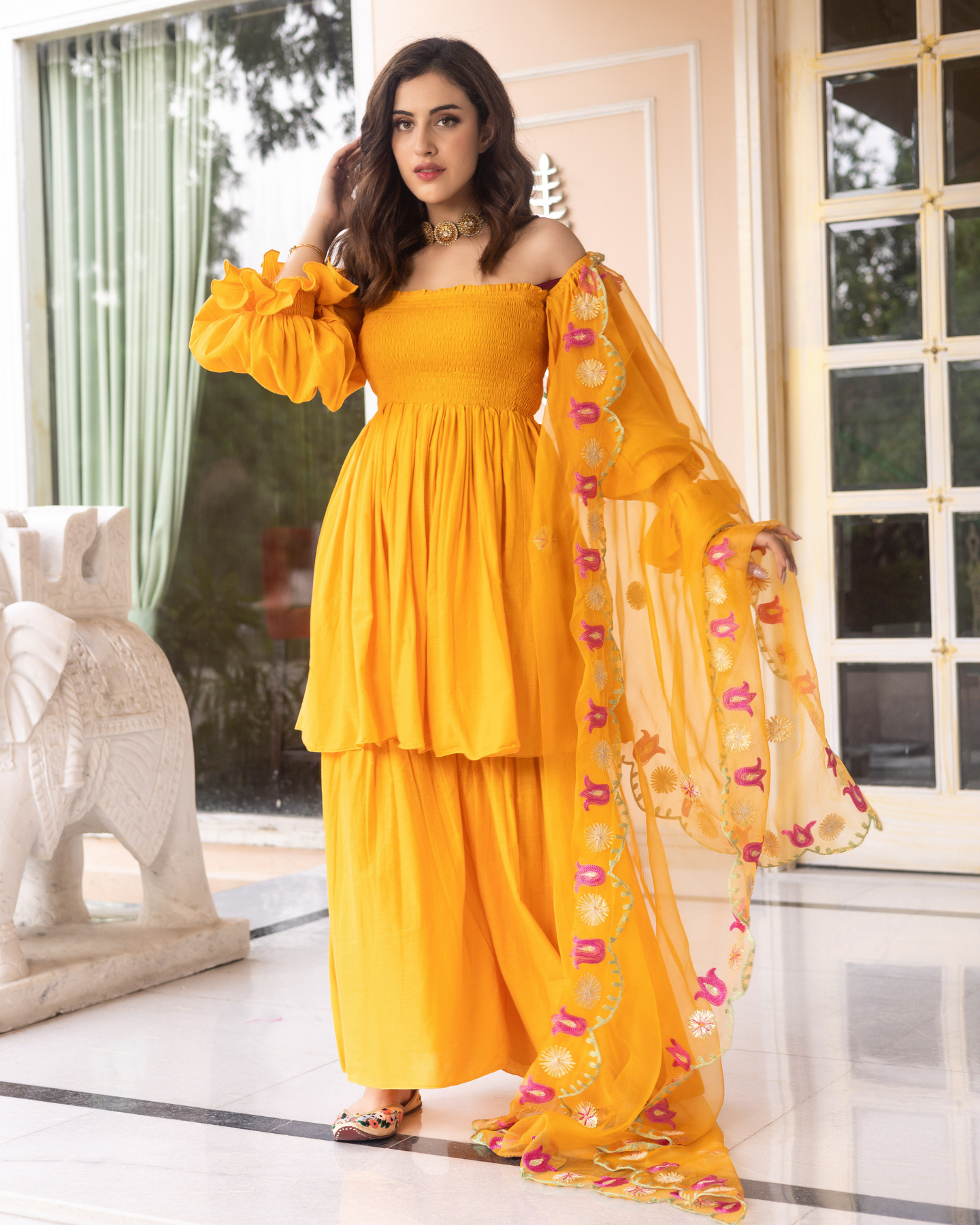 Light, bright, and full of life, this suit set will make a delightful addition to your wardrobe. Tailored with flowy silhouettes with classic golden prints, it is spruced up with a trendy fit.
